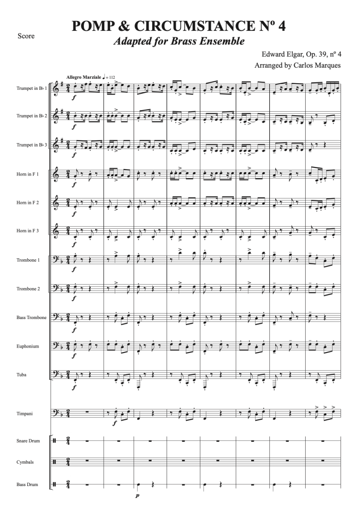 The Pomp and Circumstance Marches (full title Pomp and Circumstance Military Marches), Op. 39, are a series of five (or six) marches for orchestra composed by Sir Edward Elgar. The first four were published between 1901 and 1907. March No. 4 was completed on 7 June 1907, and dedicated “To my friend Dr. G.Robertson Sinclair, Hereford”. It was first performed on 24 August 1907, in the Queen’s Hall, London, conducted by the composer.